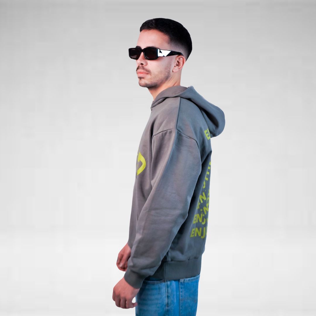 Oversized, extra-large and very resistant unisex square cut hoodie in military gray. Screen-printed “Viwid square” logo and “VIWID” on the front and logo VIWID; all in yelow.